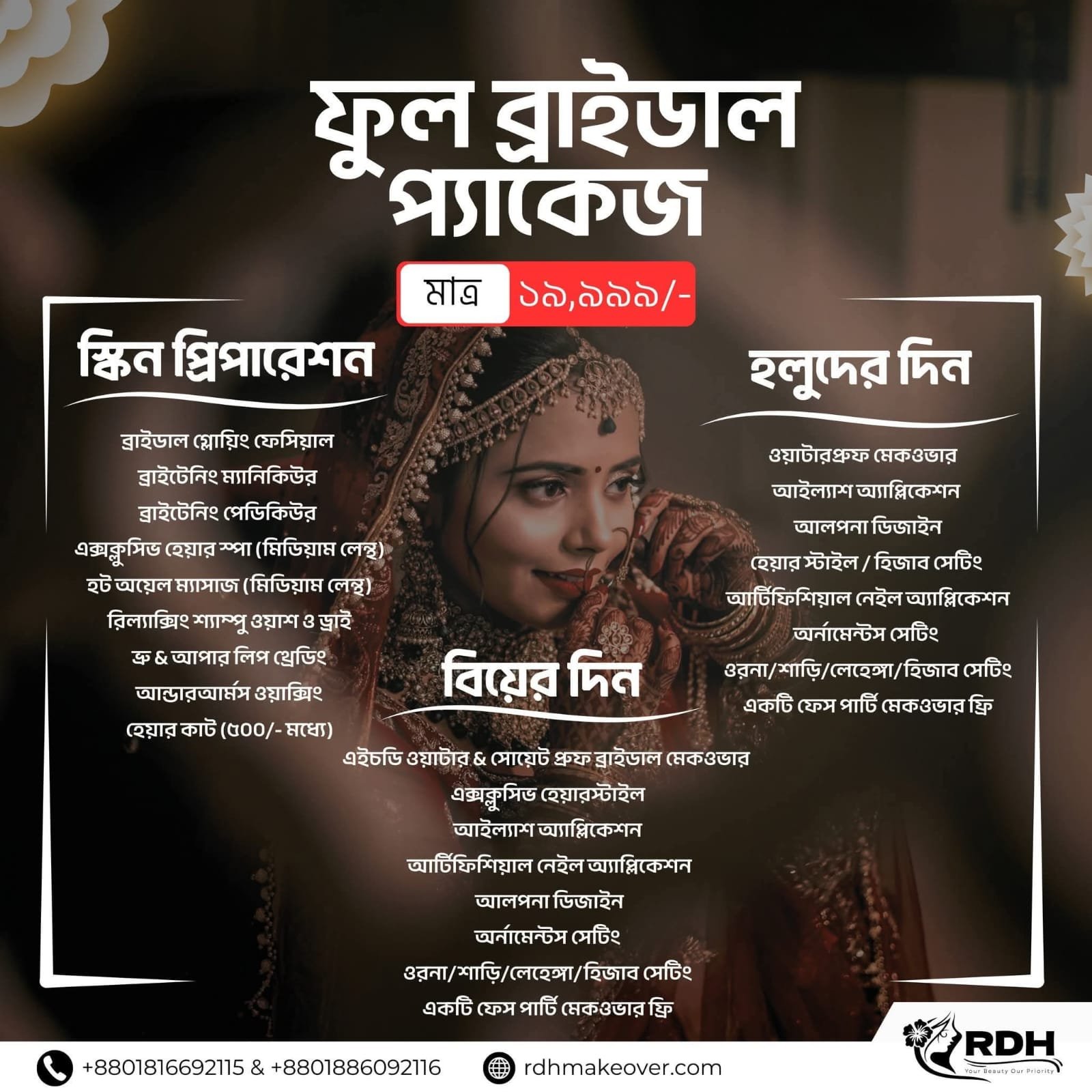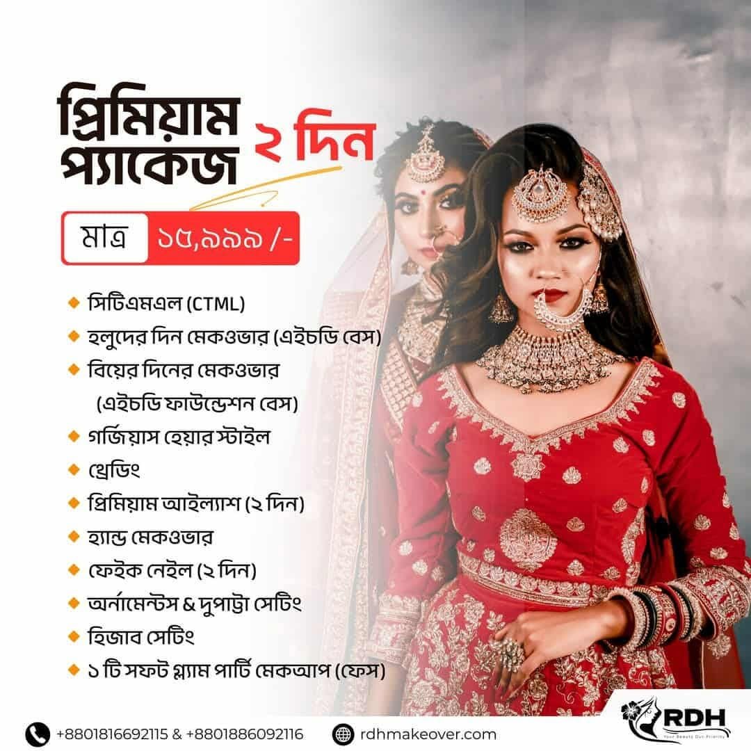এই প্রিমিয়াম ২ দিনের ব্রাইডাল প্যাকেজে কনের জন্য ফুল ব্রাইডাল মেকআপ, হেয়ার স্টাইলিং, শাড়ি ড্রেপিং ও সম্পূর্ণ লুক সেটআপ অন্তর্ভুক্ত থাকে। প্রফেশনাল প্রোডাক্ট ও স্কিন-ফ্রেন্ডলি টেকনিক ব্যবহার করে কনের লুক করা হয় গ্ল্যামারাস, ন্যাচারাল গ্লোইং ও লং-লাস্টিং ফিনিশে।